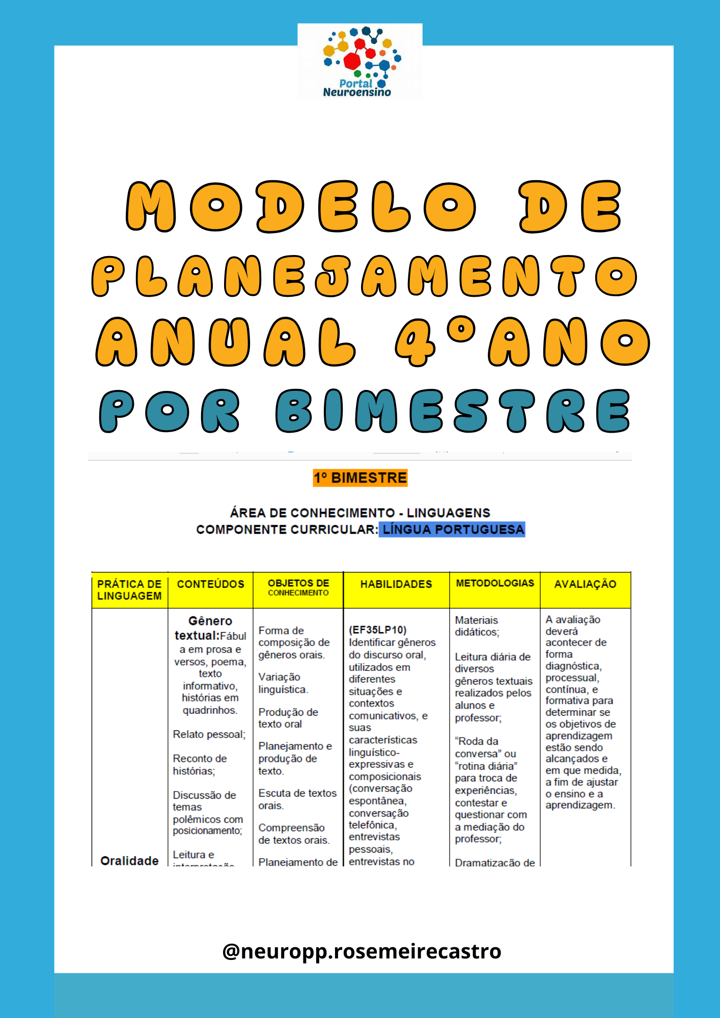 Este modelo de planejamento anual para o 4º ano do Ensino Fundamental está alinhado às diretrizes da BNCC (Base Nacional Comum Curricular), organizando as habilidades por bimestre e áreas de conhecimento.