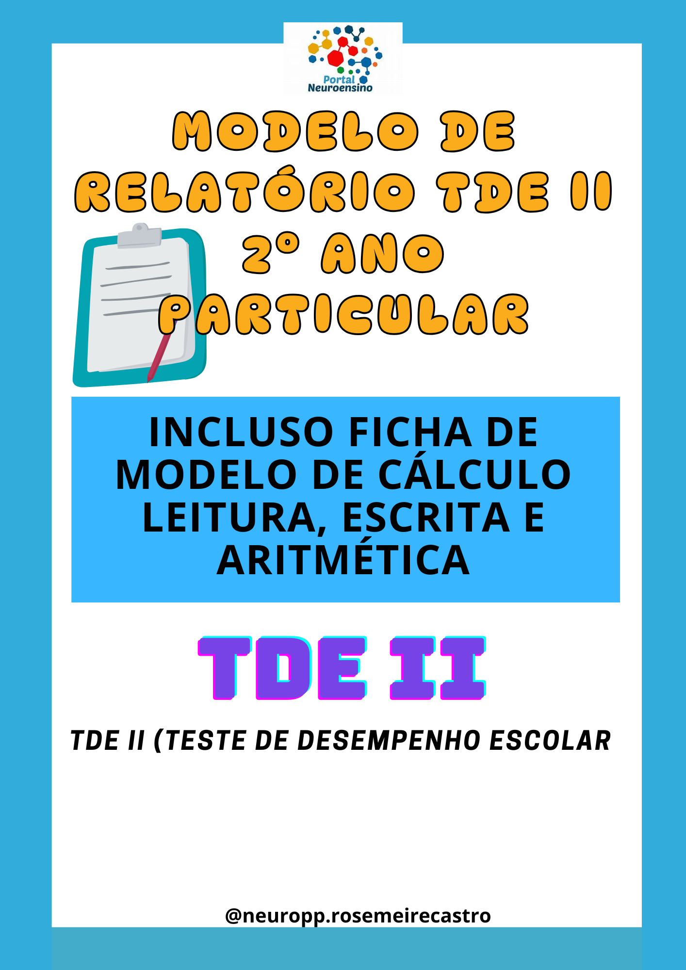 Você receberá um modelo de relatório desenvolvido da aplicação do TESTE TDE II ((Teste de Desempenho Escolar), versão editável criança autista nível 2 de suporte. Irá também as fórmulas de cada teste: Aritmética, escrita e leitura.